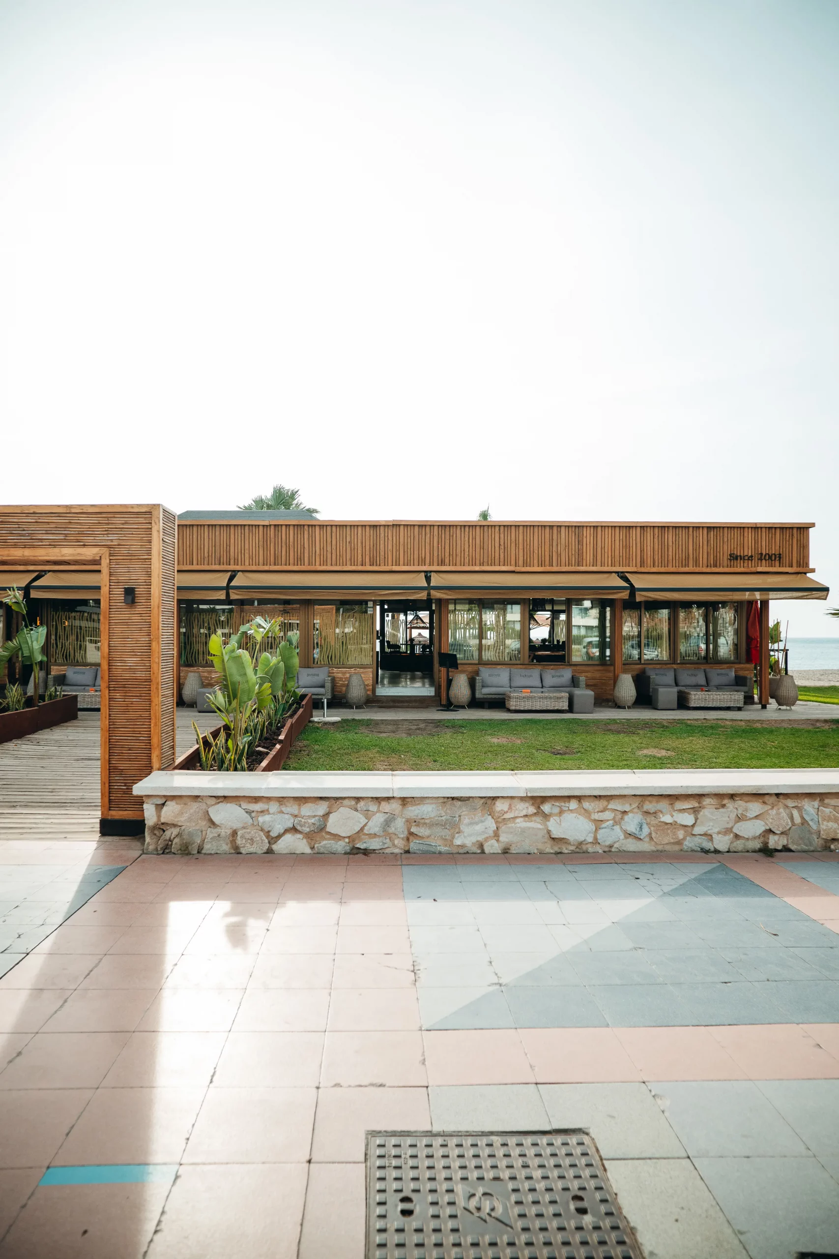 Tu mesa en chiringuito moderno con vistas al mar te está esperando